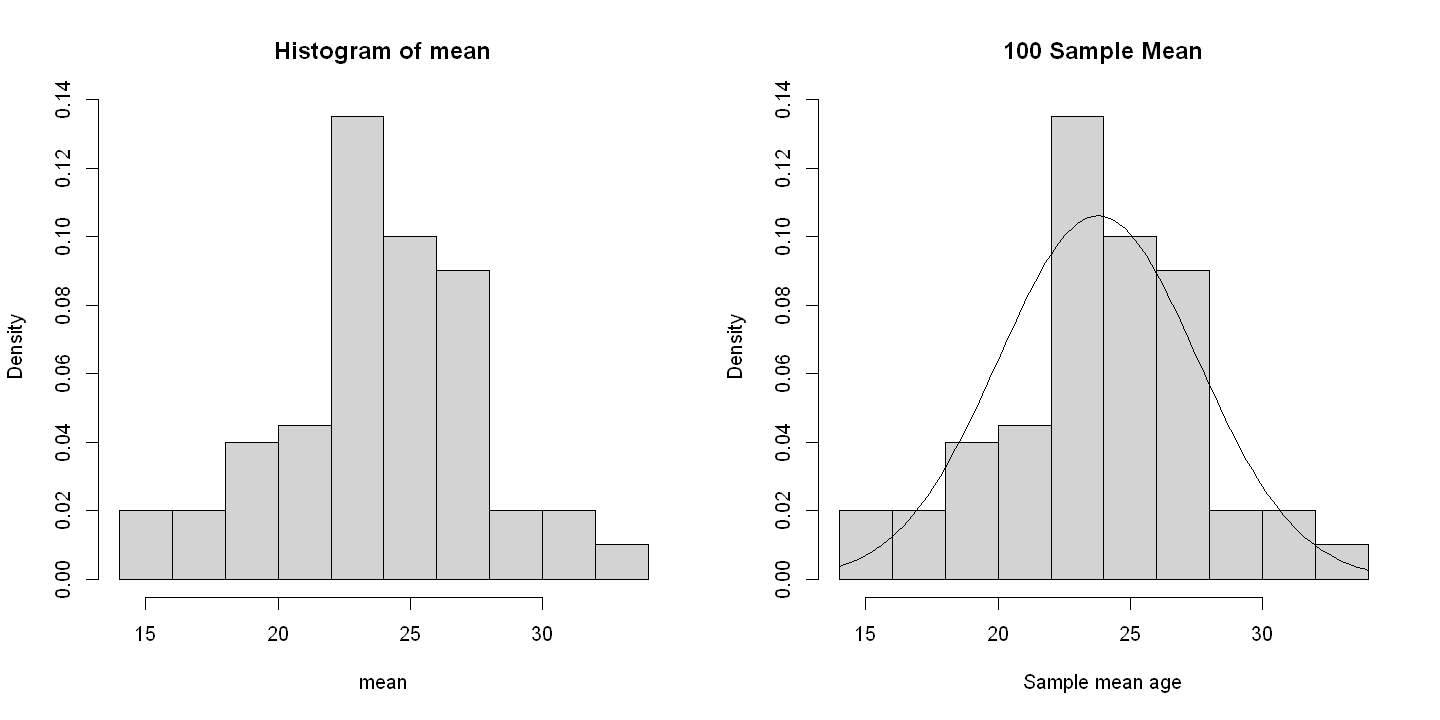 hist(mean, main="100 Sample Mean", xlab="Sample mean age", freq=FALSE)