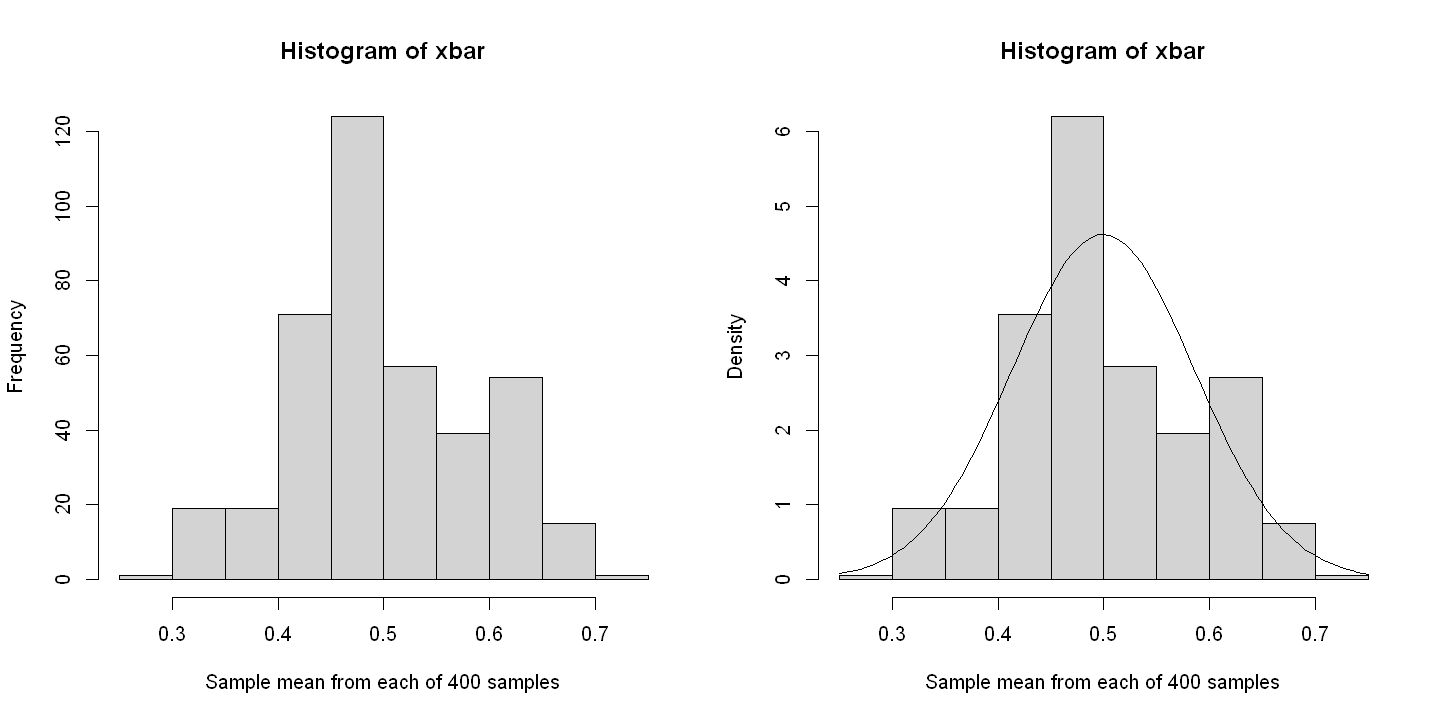 # Mean of 400 coin toss samples each of size 30