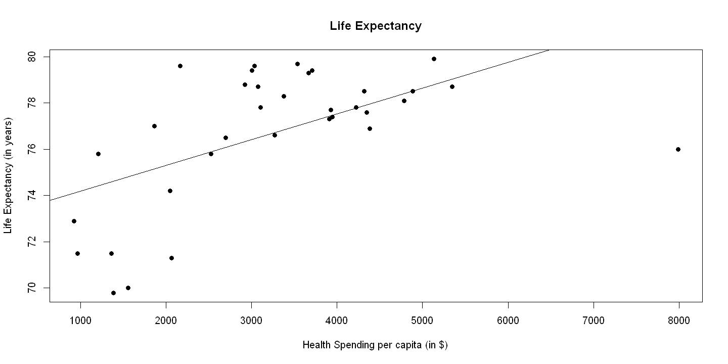 plot(hlthpc, lifeexp, xlab="Health Spending per capita (in $)",