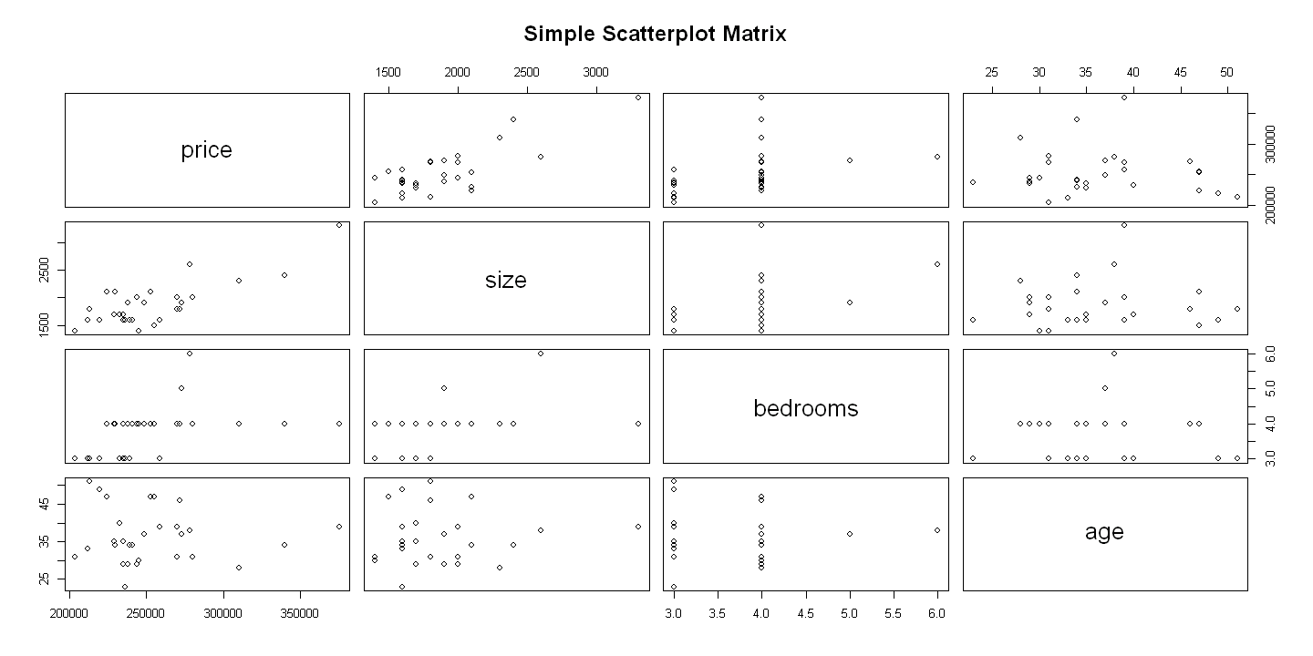 cor(cbind(price, size, bedrooms, bathrooms, lotsize, age, monthsold))