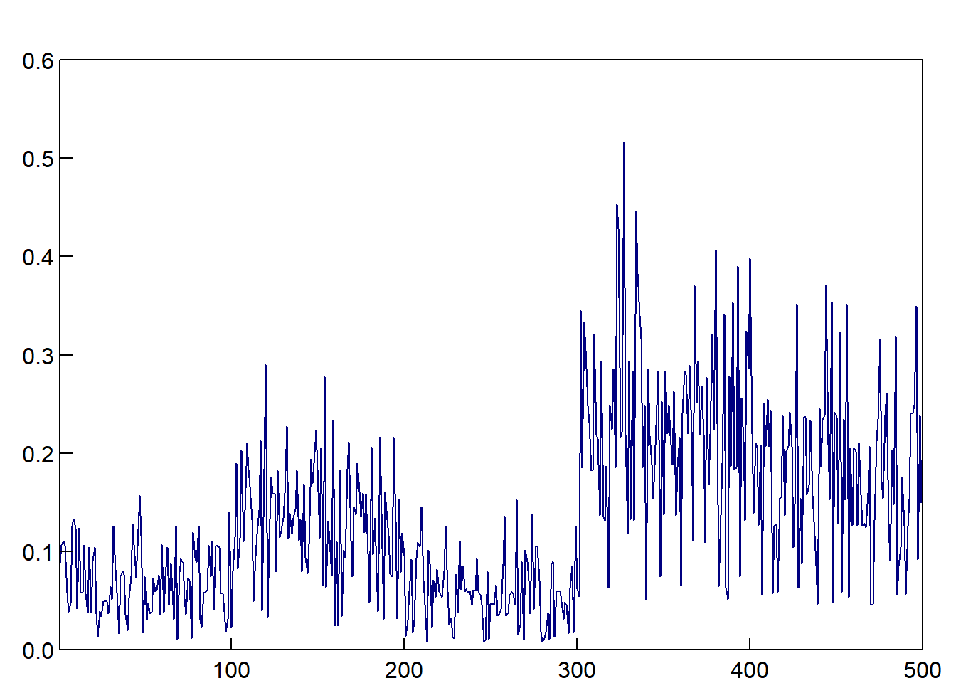 plot(probit$fitted.values,type="l",las=1,xlab="",ylab="",main="",xaxs="i",yaxs="i",tck=.02,col="navy",ylim=c(0,0.6))