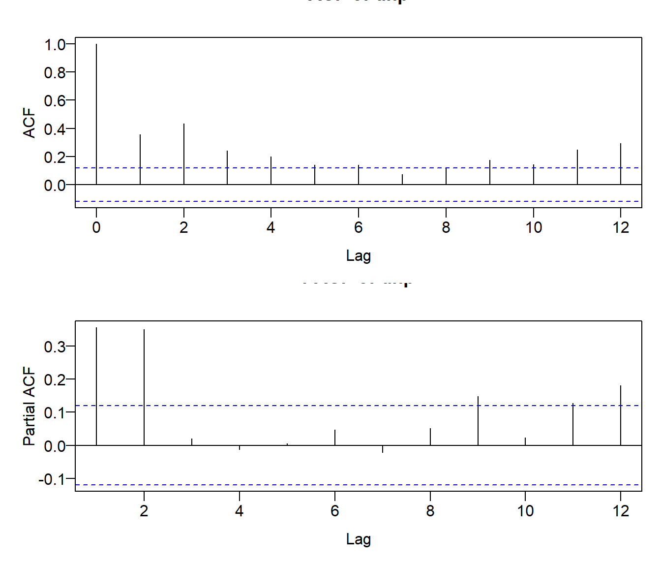 acf(data_ukhp$dhp, lag = 12, las = 1, main = "ACF of dhp")