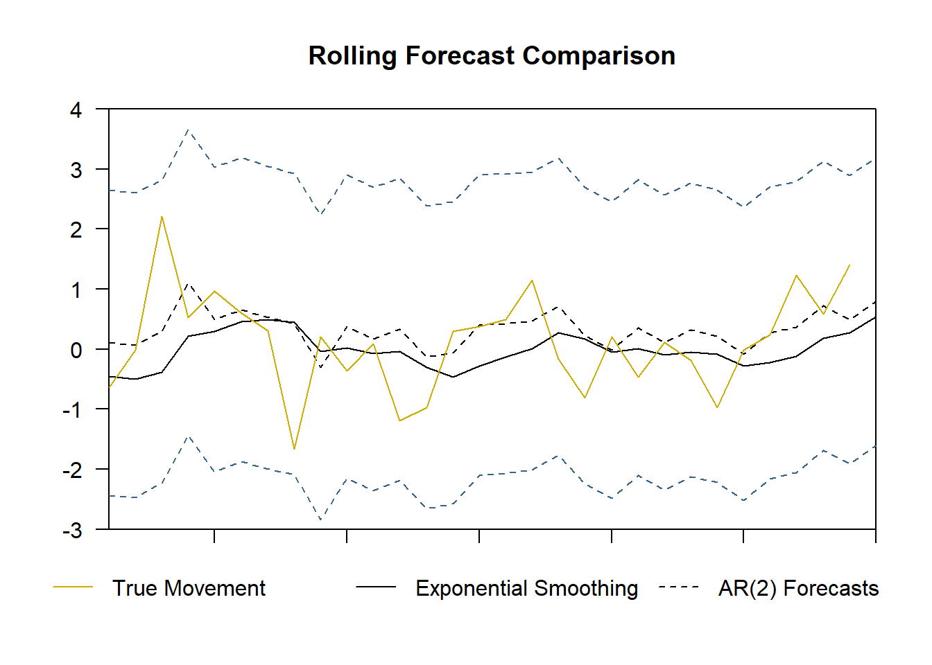 legend = c("True Movement", "Exponential Smoothing", "AR(2) Forecasts"),